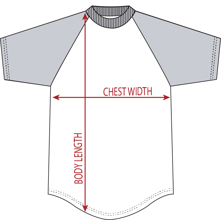 4.8 ounce 50% polyester/50% cotton jersey knit * Crew neck * Contrast color neck and sleeves * Raglan sleeves * Serged fishtail bottom