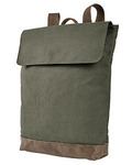 53% cotton canvas/43% polyester/4% polyurethane leather base; Cotton webbing, adjustable back straps and top carry handle; Zipper closure main compartment w/flap and magent closure; Inside lining with interior zipper pocket; Width 11" (not including gusset), Height 16"; Side seam to side seam 14.75"; Gusset 3.75"; Flap from back seam to front 8". Folded over top approx. 5" high;